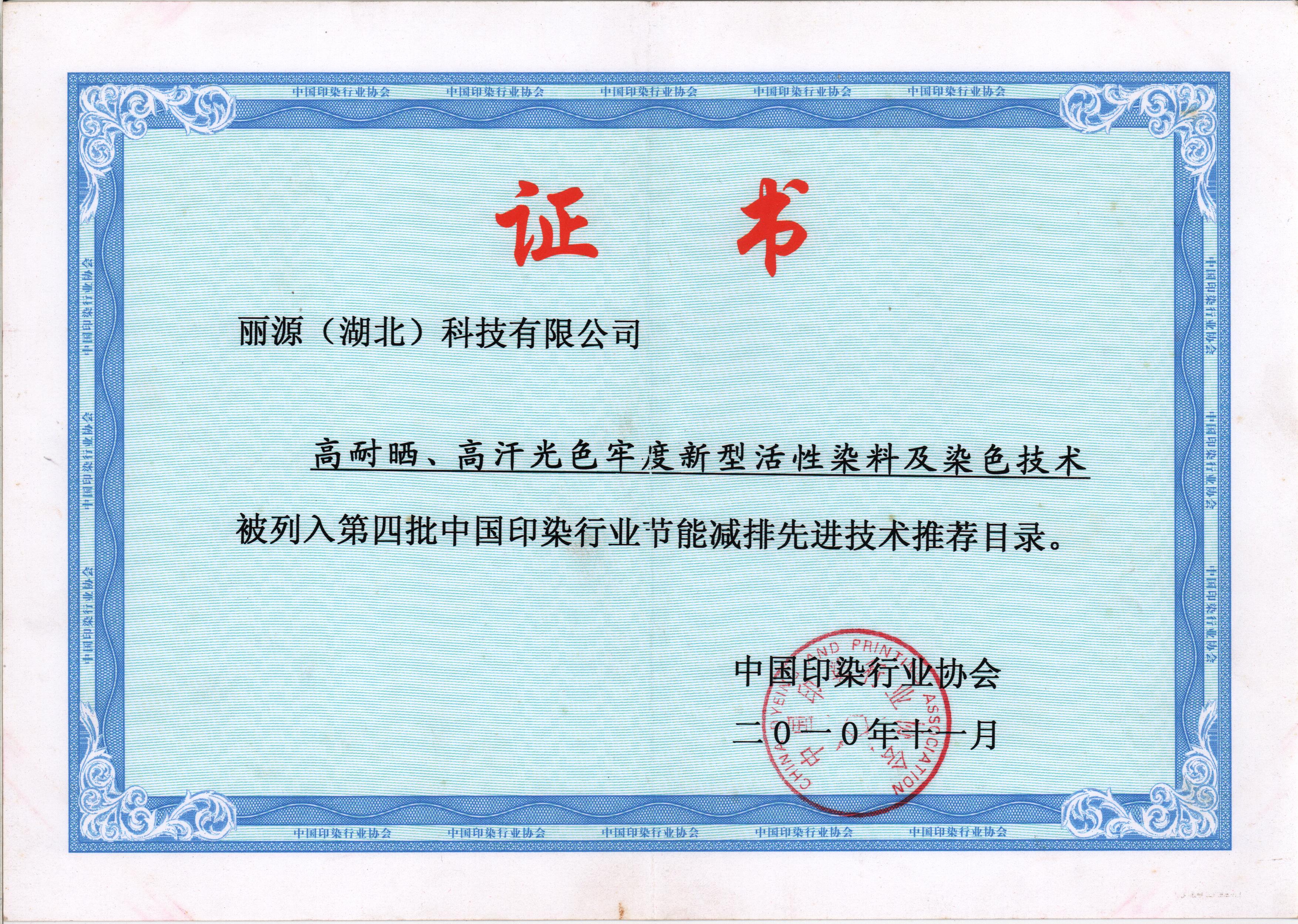 • 高耐曬、高汗光色牢新型活性染料及染色技術被列入第四批中國印染行業(yè)節(jié)能減排先進技術推薦目錄