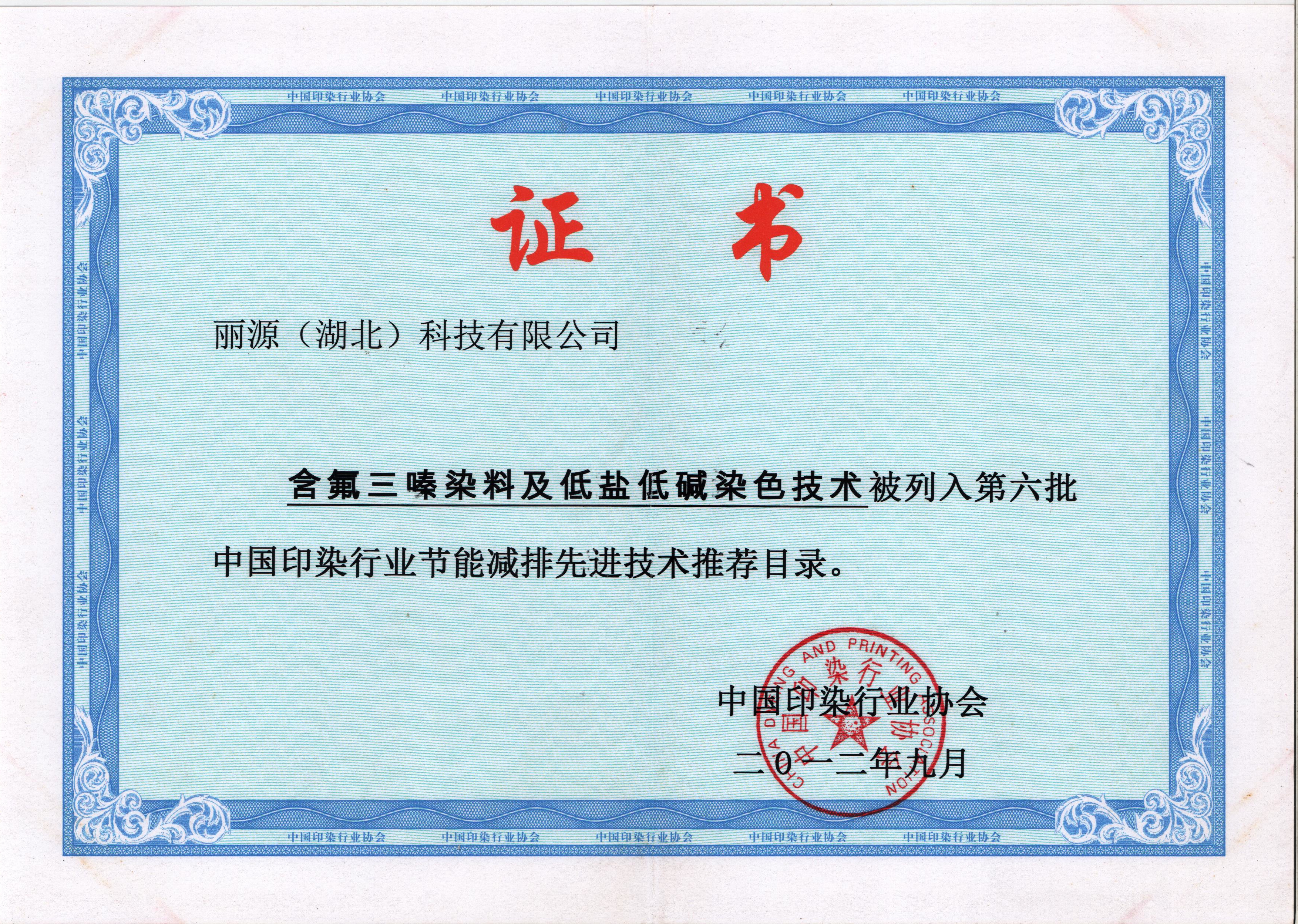 • 含氟三嗪染料及低鹽低堿染色技術被列入第六批中國印染行業(yè)節(jié)能減排先進技術推薦目錄