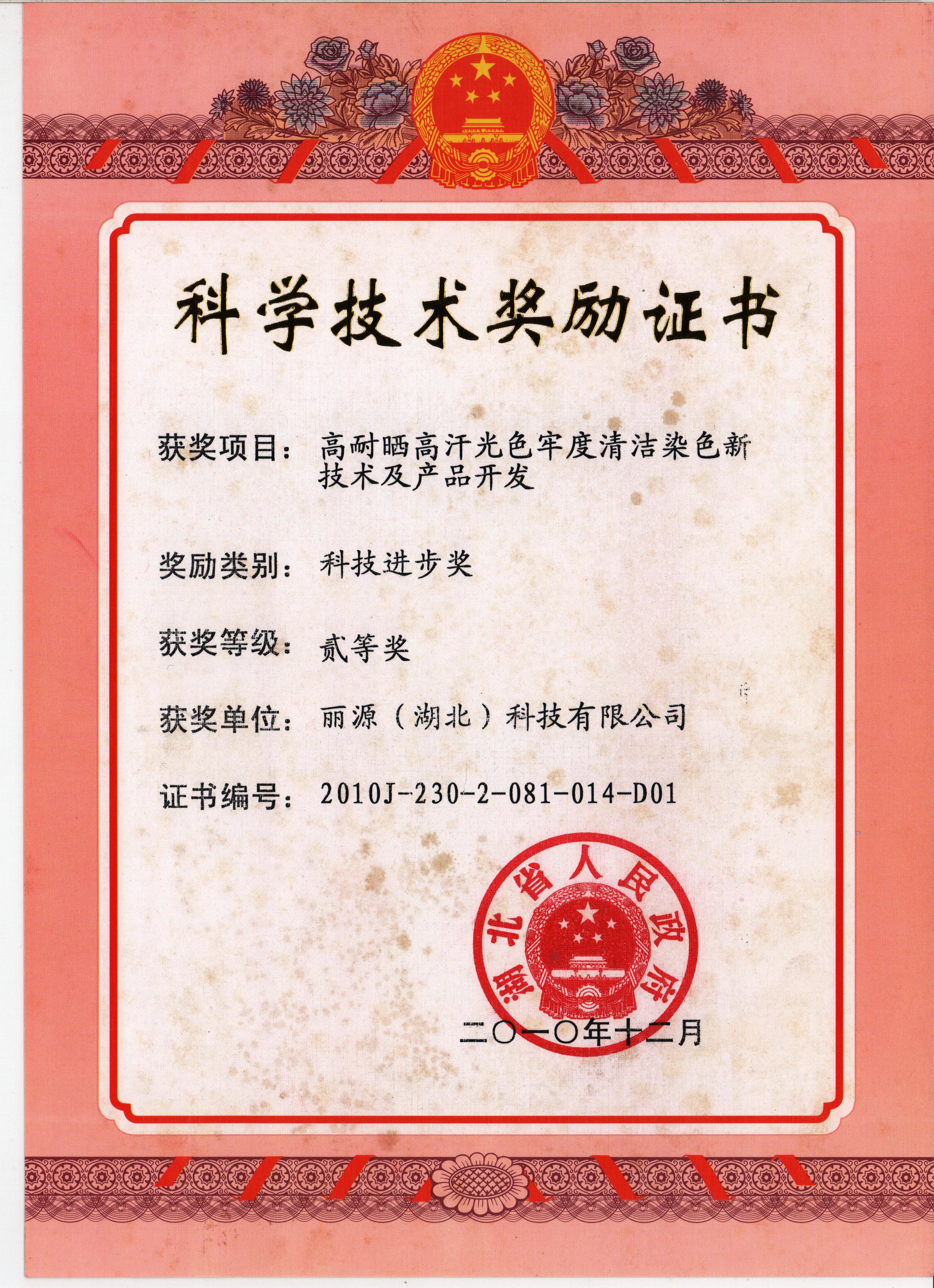 高耐曬高汗光色牢度清潔染色新技術(shù)及產(chǎn)品開發(fā)科技進步獎二等獎