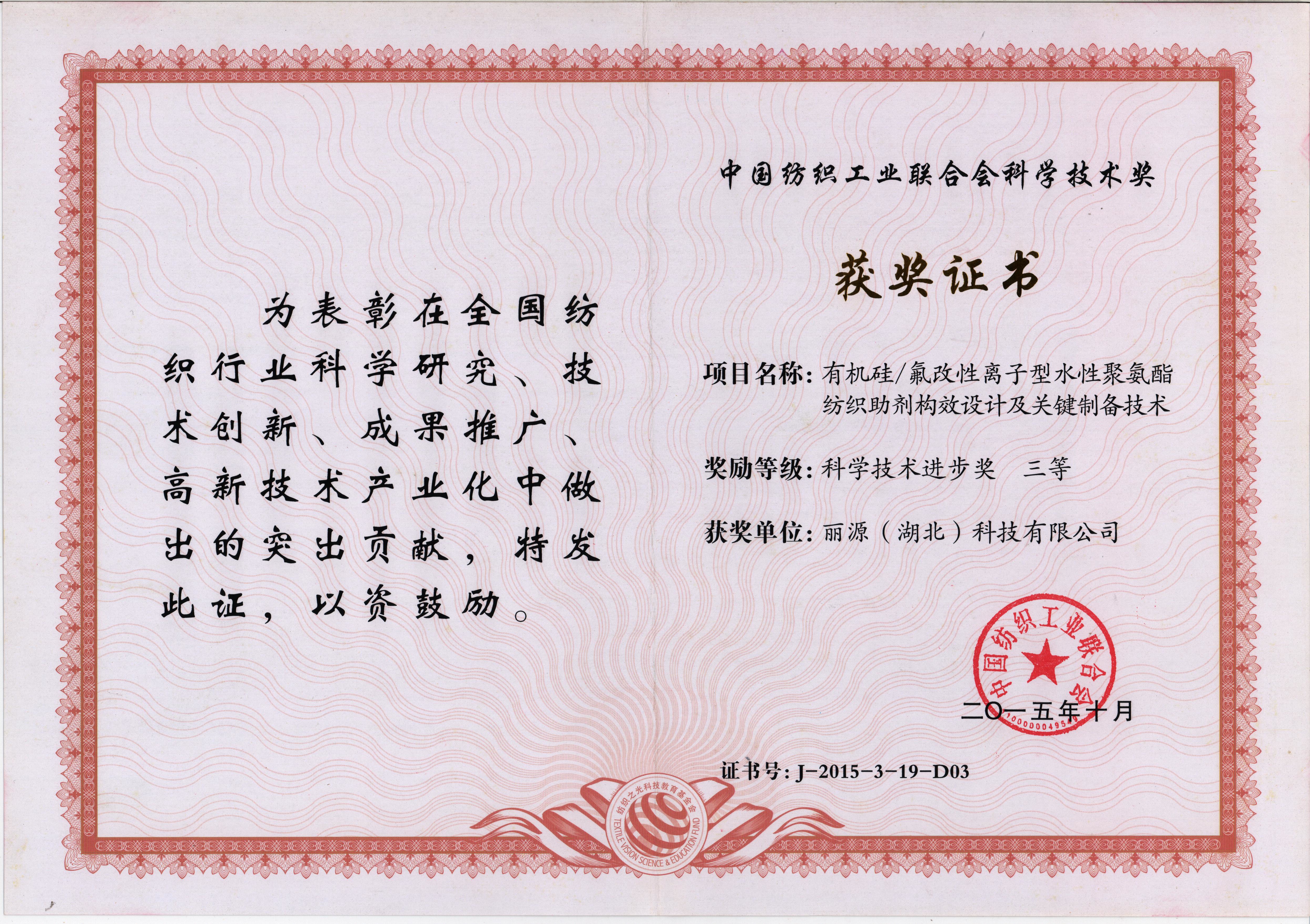 有機硅、氟改性離子型水性聚氨酯紡織助劑構(gòu)效設(shè)計及關(guān)鍵制備技術(shù) 科學技術(shù)進步獎 三等獎
